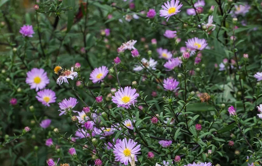 Ce que l’on aime chez cet aster, c’est le contraste entre ses fleurs rose doux et ses tiges rouge foncé. C’est sa vigueur, jamais malade. Bon développement, c’est une tapissante, donc généreuse… et tellement belle en vase. Elle peut supporter une sécheresse passagère, avec un paillage au sol c’est encore mieux.